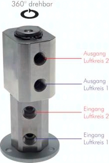 Ausführung: 2 getrennte Eingänge und 2 getrennte Ausgänge Werkstoffe: Körper: Messing vernickelt, Dichtungen: PUR, Führungszapfen, Flanschschraube und Sicherungsring: Stahl verzinkt Temperaturbereich: -10°C bis max. +85°C, andere Temperaturbereiche auf Anfrage Betriebsdruck: 0,5 - 12 bar Medien: geölte Druckluft Optional: Einsatz für Vakuum -VU, Viton-Dichtungen -V