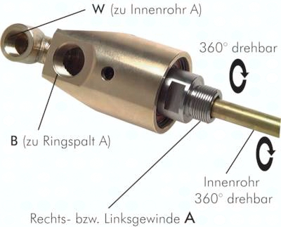 Verwendung: Drehdurchführung für kombinierte Zu- und Ableitung. Das Innenrohr* kann mit der zu versorgenden Trommel fest verbunden werden und rotierend die Ableitung des zugeführten Mediums übernehmen. Das Standrohr wird in der Drehdurchführung in eine H7-Passung gesteckt, somit ist die drehbare Funktion gewährleistet Diese Drehdurchführungen sind für den Einsatz von nicht verunreinigtem Wasser, Wärmeträgeröl und Sattdampf (intermittierend) geeignet. Optional können die Einheiten für die Durchführung von aggressiven, abrasiven Medien und verunreinigtem Wasser mit einer Sondereichtung ausgestattet werden. Vorteile: Die Federn liegen außerhalb des Medienflusses um Druckverluste zu minimieren und Turbulenzen zu vermeiden. Werkstoffe: Gehäuse: Messing, optional: Edelstahl, Dichtung: Kohlegraphit / Wolframkarbid Temperaturbereich: Wasser bis max. +175°C, Sattdampf bis max. +140°C, Wärmeträgeröl bis max. +200°C Betriebsdruck: Wasser: G 3/8" bis G 1 1/2" max. 50 bar, G 2" max. 40 bar. Sattdampf: max. 3 bar, Wärmeträgeröl: max. 6,5 bar Optional: Ausführung in Edelstahl -ES, Dichtungspaket für abrasive Medien bzw. verunreinigtes Wasser -AB Achtung: Maximale Druck- und Drehzahlwerte dürfen nicht gleichzeitig auftreten. Im Zweifelsfall sprechen Sie uns zwecks Abstimmung an. Ein Flüssigkeitsdruck, der 8 bar übersteigt, ist nur zulässig, bei Anwendung mit Kühlwasser und einer maximalen Temperatur von +50°C. Bei Wärmeträgeröl mit Temperaturen über +175°C darf die Drehzahl von 300 U/min. nicht überschritten werden. Für Reversierbetrieb sind Schäfte mit Flansch zu verwenden. Achtung: Links- und Rechtsgewinde beachten. Linksgewinde zur Zuführung bei rechtsdrehenden Trommeln verwenden. Rechtsgewinde zur Zuführung bei linksdrehenden Trommeln verwenden *Innenrohr nicht im Lieferumfang enthalten