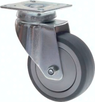 Eigenschaften: Einfache Rollenausführung für den innerbetrieblichen Einsatz auf glatten Böden. Stahlblechgehäuse, verzinkt-chromatiert. Räder mit Kunststofffelge und thermoplastischer Gummibandage, grau. Lagerart: Kugellager mit Fadenschutz (Ø 50 ohne Fadenschutz) *statische Belastung. Bei dynamischen Lasten müssen ca. 30% in Abzug gebracht werden