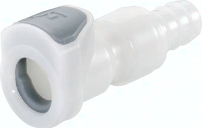 Steckerdurchmesser: 11 mm (Haltenutbreite ca. 3,4 mm) Durchfluss* Luft (Wasser): 700 - 1500 l/min (10 - 17 l/min) Funktion: Wird durch Einstecken des Steckers in die Muffe bis zum hörbaren "Klick" gekuppelt. Ein Druck auf den ergonomischen Kunststoff-Entriegelungsknopf (bei Kupplungen mit Schlauchanschluss gegen versehentliches Entriegeln geschützt) gibt den Stecker wieder frei. Es können Kupplungsstecker und Kupplungsdosen mit und ohne Absperrventil, sowie verschiedene Werkstoffe beliebig kombiniert werden. Das Absperrventil verhindert ein Austreten des Mediums im ungekuppelten Zustand. Typ POM: Werkstoffe: Körper, Ventile und Entriegelungstaste: Acetal (POM, FDA-zertifiziert), Ventilfedern: Edelstahl AISI 316, Dichtungen: NBR, äußere Feder unter Druckknopf: AISI 302, Schottmutter: Messing vernickelt Temperaturbereich: -40°C bis max. +80°C Betriebsdruck: 0 - 8,3 bar, Vakuum bis 80% Medien: Druckluft, Wasser, Alkohole, Glykol, Mineralöle, Benzin, Sauerstoff**, Kohlendioxid, milde Chemikalien Sterilisierbar duch: Formalin, Isopropylalkohol, Ethylalkohol Einsatzbereich: Für allgemeine Anwendungen. Gute Beständigkeit gegenüber Mineralölen. Typ Polypropylen: Werkstoffe: Körper, Ventile und Entriegelungstaste: Polypropylen (FDA-zertifiziert), Ventilfedern: Edelstahl AISI 316, Dichtungen: EPDM, Feder unter Druckknopf: AISI 302, Schottmutter: Messing vernickelt, Schottdichtung: EPDM Temperaturbereich: 0°C bis max. +70°C Betriebsdruck: 0 - 7,2 bar, Vakuum bis 80%, (>+27°C Druckabschläge beachten: +40°C: max. 5,4 bar, +50°C: max. 4,3 bar, +60°C: max. 3,4 bar, +70°C: max. 2,0 bar) Medien: Druckluft, Wasser, viele Säuren und Laugen, Alkohole, Glykol, MEK, Sauerstoff**, Ozon, Kohlendioxid, viele Chemikalien Sterilisierbar durch: Formalin, Isopropylalkohol, Ethylalkohol, Ethylenoxid, Gammastrahlung Einsatzbereich: Für viele Chemikalien geeignet. Keine Beständigkeit gegenüber Mineralölen. Kompatibel zu****: CPC-Colder APC, CPC-Colder EFC12 *bei 1 bar Druckabfall (je nach Konfiguration der Kupplungskombination: mit/ohne Ventil, Anschlussdimension, ... liegt der Durchfluss innerhalb des angegebenen Bereichs), **vor Verwendung mit Sauerstoff unbedingt reinigen. ****Namen und Bezeichnungen sind z.T. eingetragene Warenzeichen der jeweiligen Hersteller. ***kurze Bauform