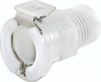 Steckerdurchmesser: 11 mm (Haltenutbreite ca. 1,3 mm) Durchfluss* Luft (Wasser): 560 - 2100 l/min (6 - 18 l/min) Funktion: Wird durch Einstecken des Steckers in die Muffe bis zum hörbaren "Klick" gekuppelt. Ein Druck auf den Entriegelungsknopf (bei Kunststoffkupplungen mit Schlauchanschluss gegen versehentliches Entriegeln geschützt) gibt den Stecker wieder frei. Es können Kupplungsstecker und Kupplungsdosen mit und ohne Absperrventil, sowie verschiedene Werkstoffe beliebig kombiniert werden. Das Absperrventil verhindert ein Austreten des Mediums im ungekuppelten Zustand. Typ POM: Werkstoffe: Körper und Ventile: Acetal (POM, FDA-zertifiziert), Ventilfedern: Edelstahl AISI 316, Dichtungen: NBR, Entriegelungstaste: AISI 301, Schottmutter: Messing vernickelt Temperaturbereich: -40°C bis max. +80°C Betriebsdruck: 0 - 8,3 bar, Vakuum bis 80% Medien: Druckluft, Wasser, Alkohole, Glykol, Mineralöle, Benzin, Sauerstoff**, Kohlendioxid, milde Chemikalien Sterilisierbar durch: Formalin, Isopropylalkohol, Ethylalkohol Einsatzbereich: Für allgemeine Anwendungen. Gute Beständigkeit gegenüber Mineralölen. Typ Polypropylen (Bitte Farbe angeben: beige = PPC oder grau = PPL): Werkstoffe: Körper und Ventile: Polypropylen (FDA-zertifiziert), Ventilfedern: Edelstahl AISI 316, Dichtungen: EPDM, Entriegelungstaste: AISI 301, Schottmutter: Messing vernickelt Temperaturbereich: 0°C bis max. +70°C Betriebsdruck: 0 - 8,3 bar, Vakuum bis 80%, (>+27°C Druckabschläge beachten: +40°C: max. 7 bar, +50°C: max. 6,5 bar, +60°C: max. 5,9 bar, +70°C: max. 5,2 bar) Medien: Druckluft, Wasser, viele Säuren und Laugen, Alkohole, Glykol, MEK, Sauerstoff**, Ozon, Kohlendioxid, viele Chemikalien Sterilisierbar durch: Formalin, Isopropylalkohol, Ethylalkohol, Ethylenoxid, Gammastrahlung Einsatzbereich: Für viele Chemikalien geeignet. Keine Beständigkeit gegenüber Mineralölen. Typ Messing verchromt: Werkstoffe: Körper: Messing verchromt (lebensmittelgeeignet), Ventile: Acetal (POM, FDA-zertifiziert), Ventilfedern: Edelstahl AISI 316, Dichtungen: NBR, Entriegelungstaste: AISI 301, Schottmutter: Messing vernickelt Temperaturbereich: -40°C bis max. +80°C Betriebsdruck: 0 - 17,3 bar, Vakuum bis 80% Medien: Druckluft, Alkohole, Glykol, Mineralöle, Benzin, Sauerstoff**, Kohlendioxid Sterilisierbar durch: Formalin, Isopropylalkohol, Ethylalkohol, Gammastrahlung, Erwärmung auf +121°C (ungekuppelt) Einsatzbereich: Für Anwendungen mit erhöhten Drücken oder mechanischen Belastungen (z.B. durch häufiges Kuppeln). Gute Beständigkeit gegenüber Mineralölen. *bei 1 bar Druckabfall (je nach Konfiguration der Kupplungskombination: mit/ohne Ventil, Anschlussdimension, ... liegt der Durchfluss innerhalb des angegebenen Bereichs), **vor Verwendung mit Sauerstoff unbedingt reinigen. Kompatibel zu****: CPC-Colder PLC, CPC-Colder PLC12, CPC-Colder LC