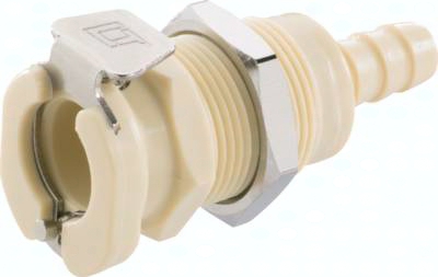 Steckerdurchmesser: 11 mm (Haltenutbreite ca. 1,3 mm) Durchfluss* Luft (Wasser): 560 - 2100 l/min (6 - 18 l/min) Funktion: Wird durch Einstecken des Steckers in die Muffe bis zum hörbaren "Klick" gekuppelt. Ein Druck auf den Entriegelungsknopf (bei Kunststoffkupplungen mit Schlauchanschluss gegen versehentliches Entriegeln geschützt) gibt den Stecker wieder frei. Es können Kupplungsstecker und Kupplungsdosen mit und ohne Absperrventil, sowie verschiedene Werkstoffe beliebig kombiniert werden. Das Absperrventil verhindert ein Austreten des Mediums im ungekuppelten Zustand. Typ POM: Werkstoffe: Körper und Ventile: Acetal (POM, FDA-zertifiziert), Ventilfedern: Edelstahl AISI 316, Dichtungen: NBR, Entriegelungstaste: AISI 301, Schottmutter: Messing vernickelt Temperaturbereich: -40°C bis max. +80°C Betriebsdruck: 0 - 8,3 bar, Vakuum bis 80% Medien: Druckluft, Wasser, Alkohole, Glykol, Mineralöle, Benzin, Sauerstoff**, Kohlendioxid, milde Chemikalien Sterilisierbar durch: Formalin, Isopropylalkohol, Ethylalkohol Einsatzbereich: Für allgemeine Anwendungen. Gute Beständigkeit gegenüber Mineralölen. Typ Polypropylen (Bitte Farbe angeben: beige = PPC oder grau = PPL): Werkstoffe: Körper und Ventile: Polypropylen (FDA-zertifiziert), Ventilfedern: Edelstahl AISI 316, Dichtungen: EPDM, Entriegelungstaste: AISI 301, Schottmutter: Messing vernickelt Temperaturbereich: 0°C bis max. +70°C Betriebsdruck: 0 - 8,3 bar, Vakuum bis 80%, (>+27°C Druckabschläge beachten: +40°C: max. 7 bar, +50°C: max. 6,5 bar, +60°C: max. 5,9 bar, +70°C: max. 5,2 bar) Medien: Druckluft, Wasser, viele Säuren und Laugen, Alkohole, Glykol, MEK, Sauerstoff**, Ozon, Kohlendioxid, viele Chemikalien Sterilisierbar durch: Formalin, Isopropylalkohol, Ethylalkohol, Ethylenoxid, Gammastrahlung Einsatzbereich: Für viele Chemikalien geeignet. Keine Beständigkeit gegenüber Mineralölen. Typ Messing verchromt: Werkstoffe: Körper: Messing verchromt (lebensmittelgeeignet), Ventile: Acetal (POM, FDA-zertifiziert), Ventilfedern: Edelstahl AISI 316, Dichtungen: NBR, Entriegelungstaste: AISI 301, Schottmutter: Messing vernickelt Temperaturbereich: -40°C bis max. +80°C Betriebsdruck: 0 - 17,3 bar, Vakuum bis 80% Medien: Druckluft, Alkohole, Glykol, Mineralöle, Benzin, Sauerstoff**, Kohlendioxid Sterilisierbar durch: Formalin, Isopropylalkohol, Ethylalkohol, Gammastrahlung, Erwärmung auf +121°C (ungekuppelt) Einsatzbereich: Für Anwendungen mit erhöhten Drücken oder mechanischen Belastungen (z.B. durch häufiges Kuppeln). Gute Beständigkeit gegenüber Mineralölen. *bei 1 bar Druckabfall (je nach Konfiguration der Kupplungskombination: mit/ohne Ventil, Anschlussdimension, ... liegt der Durchfluss innerhalb des angegebenen Bereichs), **vor Verwendung mit Sauerstoff unbedingt reinigen. Kompatibel zu****: CPC-Colder PLC, CPC-Colder PLC12, CPC-Colder LC Schottgewinde: 11/16"-24 UNS (Ø 17,5 mm), max. Blechdicke: 12 mm