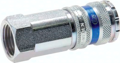 Werkstoffe: Typ MS-vernickelt: Gehäuse Messing vernickelt, Schiebehülse: Stahl vernickelt, Dichtung: NBR Typ MS/Stahl: Gehäuse: Messing vernickelt/Stahl (QPQ), Schiebehülse: Messing vernickelt, Dichtung: NBR Typ CEJN: Gehäuse Stahl/Messing verzinkt, Dichtung: NBR, Typ 1.4305: Gehäuse und Schiebehülse: 1.4305, Dichtung: Viton Temperaturbereich: -20°C bis max. +100°C (Edelstahl: -15°C bis max. +200°C) Betriebsdruck: 0 - 35 bar, sowie Grobvakuum, CEJN-Kupplungen: 0 - 16 bar Kompatibel zu***: Rectus (27, 41, 1700, 1727), TEMA (1700), CEJN (410) Durchfluss: MS-vernickelt/1.4305: 2600 l/min (Option: -BA: 2100 l/min), Messing/Stahl: 3600 l/min, CEJN-Kupplung: 3900 l/min (6 bar Eingangsdruck, 0,5 bar Druckdifferenz) Achtung: Nur folgende Paarungen von Kupplungsdose und Kupplungsstecker sind möglich: Kupplungsdose absperrend BA mit Kupplungsstecker ohne Ventil Kupplungsdose absperrend BA mit Kupplungsstecker absperrend BA ***Namen und Bezeichnungen sind z.T. eingetragene Warenzeichen der jeweiligen Hersteller. Optional: Körper aus 1.4404 -ES4A, Verwendung für Stecker beidseitig absperrend -BA