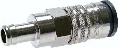 Werkstoffe: Typ MS-vernickelt: Gehäuse Messing vernickelt, Schiebehülse: Stahl vernickelt, Dichtung: NBR Typ MS/Stahl: Gehäuse: Messing vernickelt/Stahl (QPQ), Schiebehülse: Messing vernickelt, Dichtung: NBR Typ CEJN: Gehäuse Stahl/Messing verzinkt, Dichtung: NBR, Typ 1.4305: Gehäuse und Schiebehülse: 1.4305, Dichtung: Viton Temperaturbereich: -20°C bis max. +100°C (Edelstahl: -15°C bis max. +200°C) Betriebsdruck: 0 - 35 bar, sowie Grobvakuum, CEJN-Kupplungen: 0 - 16 bar Kompatibel zu***: Rectus (27, 41, 1700, 1727), TEMA (1700), CEJN (410) Durchfluss: MS-vernickelt/1.4305: 2600 l/min (Option: -BA: 2100 l/min), Messing/Stahl: 3600 l/min, CEJN-Kupplung: 3900 l/min (6 bar Eingangsdruck, 0,5 bar Druckdifferenz) Achtung: Nur folgende Paarungen von Kupplungsdose und Kupplungsstecker sind möglich: Kupplungsdose absperrend BA mit Kupplungsstecker ohne Ventil Kupplungsdose absperrend BA mit Kupplungsstecker absperrend BA ***Namen und Bezeichnungen sind z.T. eingetragene Warenzeichen der jeweiligen Hersteller. Optional: Körper aus 1.4404 -ES4A, Verwendung für Stecker beidseitig absperrend -BA