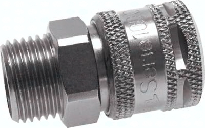 Werkstoffe: Gehäuse: Messing vernickelt, Stahl vernickelt, Dichtung: NBR Temperaturbereich: -20°C bis max. +100°C Betriebsdruck: 0 - 12 bar (Eco: bis max. 8* bar) Durchfluss: 1800 l/min (Eco: 1100 l/min) (Eingangsdruck: 6 bar, max. Druckabfall: 0,5 bar) Funktion: Das Kuppeln erfolgt wie bei Standardkupplungen durch Einstecken des Stecknippels in die Kupplungsdose. Das Entkuppeln erfolgt in 2 Schritten: Durch Zurückschieben der Entriegelungshülse schließt die Kupplungsdose und entlüftet den Kupplungsstecker, während dieser noch in der Kupplungsdose festgehalten wird. Durch Ziehen der Entriegelungshülse wird der Stecker dann freigegeben. Der gefährliche Peitschenhiebeffekt wird somit verhindert. Vorteile: keine Verletzungsgefahr beim Entriegeln der Kupplung, da der Stecker nicht ausschlägt, einfache Bedienung (Entriegelung wie Standardkupplungen) *entspricht 35 bar statischem Betriebsdruck (ohne Pulsation) Empfehlung: Kupplungsstecker aus gehärtetem Stahl verwenden! Kompatibel zu**: Rectus (25, 26, 1600, 1625), TEMA (1600), CEJN (320), JWL (520, 530, 560), Legris (25, 26), Parker (PE, PEF), Prevost (E ... 07) und viele andere deutsche Fabrikate **Namen und Bezeichnungen sind z.T. eingetragene Warenzeichen der jeweiligen Hersteller.