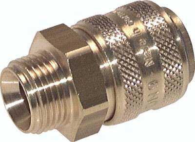 Werkstoffe: Anschluss, Ventil, Ventilkörper und Entriegelungshülse: Messing oder 1.4305, Feder, Sprengring und Verriegelungskugeln: Edelstahl, Dichtungen: Viton (PTFE-beschichtet) Temperaturbereich: -20°C bis max. +160°C Betriebsdruck: 0 - 15 bar Einsatzbereich: für flüssige Medien mit Temperaturen bis +160°C, z.B. für Kühlkreisläufe an Kunststoffmaschinen (+200°C auf Anfrage) Optional: mit Entriegelungssicherung (ist bei Edelstahlkupplung Standard) -S Zur leichteren Unterscheidung der Messingkupplungen: Kupplungsdose: Schiebehülse aus Messing blank = absperrend, Schiebehülse aus Messing vernickelt = ohne Ventil Kupplungsstecker: Stecker aus Messing blank = metrisches Gewinde, Stecker aus Messing vernickelt = zölliges Gewinde Nur folgende Paarungen von Kupplungsdose und Kupplungsstecker sind möglich: Kupplungsdose ohne Ventil OV mit Kupplungsstecker ohne Ventil, Kupplungsdose mit Ventil BA mit Kupplungsstecker mit und ohne Ventil Kompatibel zu**: Hasco (Z8 .../13 ...) **Namen und Bezeichnungen sind z.T. eingetragene Warenzeichen der jeweiligen Hersteller. *Bauform wie Z82/13/R3/8, **mit Entriegelungssicherung