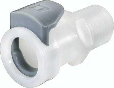 Steckerdurchmesser: 11 mm (Haltenutbreite ca. 3,4 mm) Durchfluss* Luft (Wasser): 700 - 1500 l/min (10 - 17 l/min) Funktion: Wird durch Einstecken des Steckers in die Muffe bis zum hörbaren "Klick" gekuppelt. Ein Druck auf den ergonomischen Kunststoff-Entriegelungsknopf (bei Kupplungen mit Schlauchanschluss gegen versehentliches Entriegeln geschützt) gibt den Stecker wieder frei. Es können Kupplungsstecker und Kupplungsdosen mit und ohne Absperrventil, sowie verschiedene Werkstoffe beliebig kombiniert werden. Das Absperrventil verhindert ein Austreten des Mediums im ungekuppelten Zustand. Typ POM: Werkstoffe: Körper, Ventile und Entriegelungstaste: Acetal (POM, FDA-zertifiziert), Ventilfedern: Edelstahl AISI 316, Dichtungen: NBR, äußere Feder unter Druckknopf: AISI 302, Schottmutter: Messing vernickelt Temperaturbereich: -40°C bis max. +80°C Betriebsdruck: 0 - 8,3 bar, Vakuum bis 80% Medien: Druckluft, Wasser, Alkohole, Glykol, Mineralöle, Benzin, Sauerstoff**, Kohlendioxid, milde Chemikalien Sterilisierbar duch: Formalin, Isopropylalkohol, Ethylalkohol Einsatzbereich: Für allgemeine Anwendungen. Gute Beständigkeit gegenüber Mineralölen. Typ Polypropylen: Werkstoffe: Körper, Ventile und Entriegelungstaste: Polypropylen (FDA-zertifiziert), Ventilfedern: Edelstahl AISI 316, Dichtungen: EPDM, Feder unter Druckknopf: AISI 302, Schottmutter: Messing vernickelt, Schottdichtung: EPDM Temperaturbereich: 0°C bis max. +70°C Betriebsdruck: 0 - 7,2 bar, Vakuum bis 80%, (>+27°C Druckabschläge beachten: +40°C: max. 5,4 bar, +50°C: max. 4,3 bar, +60°C: max. 3,4 bar, +70°C: max. 2,0 bar) Medien: Druckluft, Wasser, viele Säuren und Laugen, Alkohole, Glykol, MEK, Sauerstoff**, Ozon, Kohlendioxid, viele Chemikalien Sterilisierbar durch: Formalin, Isopropylalkohol, Ethylalkohol, Ethylenoxid, Gammastrahlung Einsatzbereich: Für viele Chemikalien geeignet. Keine Beständigkeit gegenüber Mineralölen. Kompatibel zu****: CPC-Colder APC, CPC-Colder EFC12 *bei 1 bar Druckabfall (je nach Konfiguration der Kupplungskombination: mit/ohne Ventil, Anschlussdimension, ... liegt der Durchfluss innerhalb des angegebenen Bereichs), **vor Verwendung mit Sauerstoff unbedingt reinigen. ****Namen und Bezeichnungen sind z.T. eingetragene Warenzeichen der jeweiligen Hersteller.
