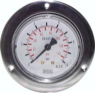 Werkstoffe: Gehäuse: Stahl schwarz, Frontring: Stahl verchromt, Messsystem und Zeigerwerk: Cu-Legierung, Sichtscheibe: Kunststoff, glasklar Anschlussgewinde: G 1/4"*, (Ø 40: G 1/8") , rückseitig, zentrisch Klasse: 2.5 Temperaturbereich: Umgebung: -20°C bis max. +60°C, Messstoff: max. +60°C Zifferblatt: 1. Skala außen (schwarz), Anzeige in bar, 2. Skala innen (rot), Anzeige in PSI Schutzart: IP 42 *mit Zentrierzapfen für Profildichtring