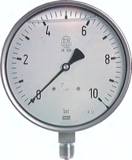 Verwendung: Manometer für besondere Sicherheit nach S 3 EN 837-1 (DIN 16006) mit ausblasbarer Rückwand und bruchsicherer Trennwand Werkstoffe: Gehäuse: 1.4301, Messsystem und Anschluss: 1.4404, Sichtscheibe: Mehrschichten-Sicherheitsglas Anschlussgewinde: G 1/2"* Klasse: 1.0 Temperaturbereich: Umgebung: -20°C bis max. +60°C, Messstoff: max. +100°C Schutzart: IP 65 *mit Zentrierzapfen für Profildichtring