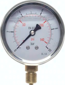 Werkstoffe: Gehäuse: 1.4301, Messsystem: Cu-Legierung, Anschluss: Messing, Sichtscheibe: Polycarbonat Anschlussgewinde: G 1/4"* Klasse: 1.6 Temperaturbereich: Umgebung: -20°C bis max. +60°C, Messstoff: max. +60°C Zifferblatt: 1. Skala außen (schwarz), Anzeige in bar, 2. Skala innen (rot), Anzeige in PSI Schutzart: IP 65 *mit Zentrierzapfen für Profildichtring
