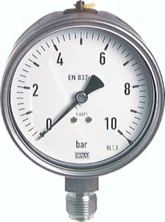 Werkstoffe: Gehäuse: 1.4301, Messsystem und Anschluss: 1.4404, Sichtscheibe: Mehrschichten-Sicherheitsglas Anschlussgewinde: G 1/2"* Klasse: 1.0 Temperaturbereich: Umgebung: -40°C bis max. +60°C, Messstoff: max. +200°C Schutzart: IP 65 Optional: Anschluss 1/2" NPT-Gewinde -NPT *mit Zentrierzapfen für Profildichtring