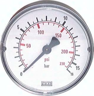 Werkstoffe: Gehäuse: Kunststoff schwarz, Anschluss und Zeigerwerk: Messing, Sichtscheibe: Kunststoff glasklar Anschlussgewinde: G 1/4"** (Ø 40: G 1/8"), rückseitig zentrisch Klasse: 2.5 Temperaturbereich: Umgebung: -40°C bis max. +60°C, Messstoff: max. +60°C Zifferblatt: 1. Skala außen (schwarz), Anzeige in bar, 2. Skala innen (rot), Anzeige in PSI Schutzart: IP 42 Optional: Gehäuse aus Stahlblech, Klasse 1.6 -ST *Skala nur in bar, **mit Zentrierzapfen für Profildichtring