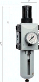 Ausführung: Druckregler rücksteuerbar (mit Sekundärentlüftung) mit zusätzlicher Filterung durch Zentrifugalprinzip und Sinterfilter Werkstoffe: Körper: Grivory® (PA 66), Federhaube: POM, Membrane und Dichtungen: NBR, Kondensatbehälter: Polycarbonat Temperaturbereich: -10°C bis max. +50°C Eingangsdruck: 1,5 - 16 bar Kondensatentleerung: halbautomatisch** Manometeranschluss: G 1/4" Porenweite im Filter: 5 µm Medien: Druckluft, neutrale Gase Vorteile: automatische Entlüftung bei Überdruck auf der Sekundärseite, einfacher Zusammenbau von Einzelkomponenten durch Koppelpakete innerhalb einer Baureihe, Handrad kann durch Herunterdrücken arretiert und mit Schloss verriegelt werden max. Kondensatmenge: 87 cm³ Schalttafelgewinde: M 50 x 1,5 Lieferumfang: Filterregler einschließlich 50 mm Manometer Durchfluss: 14000 l/min, Sekundärentlüftung: 120 l/min Eigenluftverbrauch: max. 1,5 l/min Optional: Ausführung mit Metallbehälter und Sichtrohr -M, Ablassautomatik -AM, Ablassautomatik drucklos geschlossen (Eingangsdruck 0 - 16 bar) -AMNC, Sicherheitsausführung: mit vorgeschaltetem, abschließbaren Kugelhahn und Befüllventil -Si *Standardbaureihe, bitte bevorzugt einsetzen, da Regelbereich universal einsetzbar, **Sobald der Eingangsdruck unter den min. Eingangsdruck fällt, öffnet das Ablassventil automatisch. Durch Festdrehen der Ablassschraube kann die halbautomatische Ablassventilöffnung verhindert werden.
