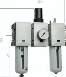 Ausführung: Filter, Druckregler rücksteuerbar, mit angebautem Öler Werkstoffe: Körper: Grivory®, Federhaube: POM, Membrane und Dichtungen: NBR, Behälter: Polycarbonat Temperaturbereich: bis max. +50°C Eingangsdruck: 1,5 - 16 bar (Baureihe 0: 1,5 - 12 bar) Kondensatentleerung: halbautomatisch** Manometeranschluss: G 1/4" Porenweite im Filter: 5 µm Medien: Druckluft, neutrale Gase Vorteile: automatische Entlüftung bei Überdruck auf der Sekundärseite, einfacher Zusammenbau von Einzelkomponenten durch Koppelpakete innerhalb einer Baureihe, Handrad kann durch Herunterdrücken arretiert und mit Schloss verriegelt werden - bitte verwenden Sie VHS 20, halbautomatische Ölbefüllung durch Anschließen eines Schlauches unten an den Ölbehälter (G 1/8"). Durch diesen Schlauch wird bei Drücken des Öleinfüllknopfes das Öl in den Behälter gesaugt (nicht Baureihe 0). max. Kondensatmenge: 87 cm³ Schalttafelgewinde: M 50 x 1,5 Lieferumfang: Wartungseinheit einschließlich 50 mm Manometer Eigenluftverbrauch: max. 1,5 l/min Öldosierung bei 1000 l/min: ca. 1 - 2 Tropfen/min Ölvorrat: 181 cm³ Öleransprechgrenze (bei 6 bar): 115 l/min Optional: Ausführung mit Metallbehälter und Sichtrohr -M, Ablassautomatik -AM, Ablassautomatik drucklos geschlossen (Eingangsdruck 0 - 16 bar) -AMNC *Standardbaureihe, bitte bevorzugt einsetzen, da Regelbereich universal einsetzbar, **Sobald der Eingangsdruck unter den min. Eingangsdruck fällt, öffnet das Ablassventil automatisch. Durch Festdrehen der Ablassschraube kann die halbautomatische Ablassventilöffnung verhindert werden.