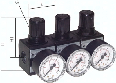 Ausführung: rücksteuerbar (mit Sekundärentlüftung) Werkstoffe: Körper: Zink Druckguss Z410 (Baureihe 5: Aluminium), Federhaube: POM, Membrane und Dichtungen: NBR Temperaturbereich: -10°C bis max. +60°C Eigenluftverbrauch: keiner (Baureihe 5: max. 0,5 l/min, Präzisionsregler: ca. 2,6 l/min) Manometeranschluss: G 1/4" (Baureihe 0: G 1/8") Medien: geölte und ungeölte Druckluft, neutrale Gase Vorteile: automatische Entlüftung bei Überdruck auf der Sekundärseite, einfacher Zusammenbau von Einzelkomponenten durch Koppelpakete innerhalb einer Baureihe und Gewindegröße, Handrad kann durch Herunterdrücken arretiert werden. Eingangsdruck: 16 bar (Baureihe 0: max. 12 bar bei Verwendung von Koppelpaket) Schalttafelgewinde: Baureihe 0 und 1: M 30 x 1,5, Baureihe 2: M 50 x 1,5 Optional: abschließbar durch Zylinderschloss -K, abschließbar durch Zylinderschloss mit E 11-Schließung** -KE11 Vorteile: Durch Verblockung mehrerer Regler können über eine Druckversorgung mehrere Druckluftkreise mit unabhängig regelbaren Drücken versorgt werden. Der Druckluftabgang ist gegenüber dem Manometer angeordnet. *Standardbaureihe, bitte bevorzugt einsetzen, da Regelbereich universal einsetzbar, **Volkswagen-Schließung (wird ohne Schlüssel geliefert)