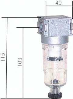 Ausführung: Filterung durch Zentrifugalprinzip und Sinterfilter Werkstoffe: Körper: Zink Druckguss Z410 (Baureihe 5: Aluminium), Dichtungen: NBR, Kondensatbehälter: Polycarbonat Temperaturbereich: bis max. +60°C Porenweite im Filter: 5 µm (Baureihe 5: 40 µm, auf Wunsch 8 µm) Kondensatentleerung: halbautomatisch* Medien: Druckluft, neutrale Gase Vorteile: Einfacher Zusammenbau von Einzelkomponenten durch Koppelpakete innerhalb einer Baureihe und Gewindegröße. Eingangsdruck: 1,5 bis max. 16 bar (bei Verwendung von Koppelpaket max. 12 bar) max. Kondensatmenge: 16 cm³ Optional: Ausführung mit Metallbehälter -MB, Ablassautomatik -AM, Ablassautomatik drucklos geschlossen (0 - 16 bar) -AMNC *sobald der Eingangsdruck unter den min. Eingangsdruck fällt, öffnet das Ablassventil automatisch. Durch Festdrehen der Ablassschraube kann die halbautomatische Ablassventilöffnung verhindert werden.