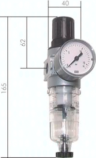 Ausführung: Druckregler rücksteuerbar (mit Sekundärentlüftung) mit zusätzlicher Filterung durch Zentrifugalprinzip und Sinterfilter Werkstoffe: Körper: Zink Druckguss Z410 (Baureihe 5: Aluminium), Federhaube: POM, Membrane und Dichtungen: NBR, Kondensatbehälter: Polycarbonat Temperaturbereich: bis max. +60°C Manometeranschluss: G 1/4" (Baureihe 0: G 1/8") Eigenluftverbrauch: keiner (Baureihe 5: max. 0,5 l/min) Porenweite im Filter: 5 µm (Baureihe 5: 40 µm, auf Wunsch 8 µm) Kondensatentleerung: halbautomatisch**** Medien: Druckluft, neutrale Gase Vorteile: automatische Entlüftung bei Überdruck auf der Sekundärseite, einfacher Zusammenbau von Einzelkomponenten durch Koppelpakete innerhalb einer Baureihe und Gewindegröße, Handrad kann durch Herunterdrücken arretiert werden. Eingangsdruck: 1,5 bis max. 16 bar (bei Verwendung von Koppelpaket max. 12 bar) max. Kondensatmenge: 16 cm³ Schalttafelgewinde: M 30 x 1,5 Optional: abschließbar durch Zylinderschloss -K, abschließbar durch Zylinderschloss mit E 11-Schließung** -KE11, Ausführung mit Metallbehälter -MB, Ablassautomatik -AM, Ablassautomatik drucklos geschlossen (0 bis 16 bar) -AMNC *Standardbaureihe, bitte bevorzugt einsetzen, da Regelbereich universal einsetzbar, **Volkswagen-Schließung (wird ohne Schlüssel geliefert), ****Sobald der Eingangsdruck unter den min. Eingangsdruck fällt, öffnet das Ablassventil automatisch. Durch Festdrehen der Ablassschraube kann die halbautomatische Ablassventilöffnung verhindert werden.