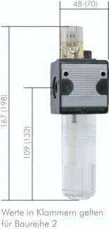 Werkstoffe: Körper: Zink Druckguss Z410 (Baureihe 5: Aluminium), Dichtungen: NBR, Ölvorratsbehälter: Polycarbonat Temperaturbereich: bis max. +60°C Medien: Druckluft, neutrale Gase Vorteile: Einfacher Zusammenbau von Einzelkomponenten durch Koppelpakete innerhalb einer Baureihe und Gewindegröße. Eingangsdruck: max. 16 bar (mit Metallbehälter max. 20 bar*) Öldosierung bei 1000 l/min: ca. 10 - 20 Tropfen/min Ansprechgrenze (6 bar): Typ M OL 14: 26 l/min, Typ M OL 12: 60 l/min Optional: Ausführung mit Schutzkorb -S, Ausführung mit Metallbehälter* und Sichtrohr -M Vorteile: besonders feiner Ölnebel *Tropfaufsatz aus Metall/Glas-Kombination