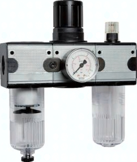 Ausführung: Filter, Druckregler rücksteuerbar, Öler (Baureihe 0 mit Micro-Nebelöler) Werkstoffe: Körper: Zink Druckguss Z410 (Baureihe 5: Aluminium), Federhaube: POM, Membrane und Dichtungen: NBR, Behälter: Polycarbonat Temperaturbereich: bis max. +60°C Manometeranschluss: G 1/4" (Baureihe 0: G 1/8") Eigenluftverbrauch: keiner (Baureihe 5: max. 0,5 l/min) Porenweite im Filter: 5 µm (Baureihe 5: 40 µm, auf Wunsch 8 µm) Kondensatentleerung: halbautomatisch**** Medien: Druckluft, neutrale Gase Vorteile: automatische Entlüftung bei Überdruck auf der Sekundärseite, einfacher Zusammenbau von Einzelkomponenten durch Koppelpakete innerhalb einer Baureihe und Gewindegröße, Handrad kann durch Herunterdrücken arretiert werden. Eingangsdruck: 1,5 - 16 bar (mit Metallbehälter max. 20 bar**) max. Kondensatmenge: 50 cm³ Schalttafelgewinde: M 50 x 1,5 Öleransprechgrenze (6 bar): 140 l/min Ölvorrat: 125 cm³ Öldosierung bei 1000 l/min: ca. 1 - 2 Tropfen/min Optional: abschließbar durch Zylinderschloss -K, abschließbar durch Zylinderschloss mit E 11-Schließung*** -KE11, Ausführung mit Schutzkorb -S, Ausführung mit Metallbehälter** und Sichtrohr -M, Ablassautomatik -AM, Ablassautomatik drucklos geschlossen (0 - 16 bar) -AMNC Vorteile: Befüllung mit Öl unter Druck möglich. *Standardbaureihe, bitte bevorzugt einsetzen, da Regelbereich universal einsetzbar, **Tropfaufsatz aus Metall/Glas-Kombination, Metallbehälter M mit Ablassautomatik AM: 1,5 - 16 bar, ***Volkswagen-Schließung (wird ohne Schlüssel geliefert), ****Sobald der Eingangsdruck unter den min. Eingangsdruck fällt, öffnet das Ablassventil automatisch. Durch Festdrehen der Ablassschraube kann die halbautomatische Ablassventilöffnung verhindert werden.