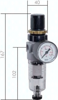 Ausführung: Druckregler rücksteuerbar (mit Sekundärentlüftung) mit zusätzlicher Filterung durch Zentrifugalprinzip und Filter Werkstoffe: Körper: Zink Druckguss Z410 (Baureihe 5: Aluminium), Membrane und Dichtungen: NBR, Kondensatbehälter: Polycarbonat. (Baureihe Mini: Federhaube: POM) Temperaturbereich: 0°C bis max. +60°C Eingangsdruck: 1,5 - 16 bar Kondensatentleerung: halbautomatisch** Medien: Druckluft, ungiftige und nicht brennbare Gase Vorteile: automatische Entlüftung bei Überdruck auf der Sekundärseite, Handrad kann durch Herunterdrücken arretiert werden **Sobald der Eingangsdruck unter den min. Eingangsdruck fällt, öffnet das Ablassventil automatisch. Durch Festdrehen der Ablassschraube kann die halbautomatische Ablassventilöffnung verhindert werden. Manometeranschluss: G 1/8" Porenweite im Filter: 5 µm max. Kondensatmenge: 16 cm³ Schalttafelgewinde: M 30 x 1,5 Optional: Ausführung mit Metallbehälter (1,5 - 25 bar) -M *Standardbaureihe, bitte bevorzugt einsetzen, da Regelbereich universal einsetzbar