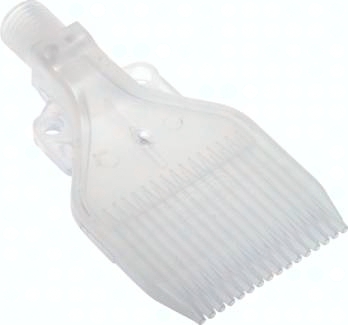 Druckbereich: max. 6 bar Temperaturbereich: POM: max. +50°C, PP: max. +60°C, Aluminium: max. +200°C, 1.4404: max. +550°C Verwendung: Mehrkanaldüsen sind besonders leise und sparsam. Besonders geeignet zum breitflächigen Abblasen von Wasser oder Staub sowie Ausblasen und Weitertransport von Stanz-, Kunststoff- und elastomeren Formteilen. Achtung: Verwenden Sie für das Einschrauben der zölligen Düsen in BLP 14: Gewindeadapter Typ RN M12X1,25-14 MS