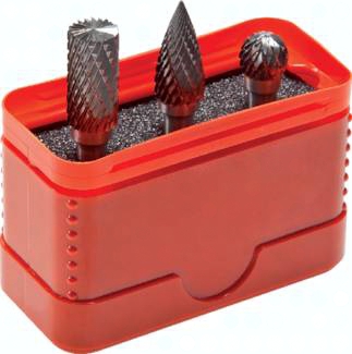 Beschreibung: Hochwertige Hartmetall-Frässtifte mit Kreuzverzahnung (KVZ 4) zum Entgraten, Konturenbearbeitung, Schweißnahtbearbeitung, Oberflächenbearbeitung, Verputzen von hochlegierten, rost-, säure- und hitzebeständigen Stählen, Guss und Kunststoffen Verwendung: in Schleifern mit 6,0 mm (3,0 mm) Spannschaft, Schnittgeschwindigkeit 300 m/min (Drehzahlen entsprechend 6000 - 25000 U/min)