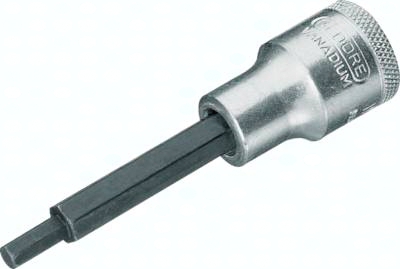 Ausführung: Steckschlüssel- und Schraubendrehereinsätze mit Innenvierkantantrieb nach DIN 3120-C12.5, ISO 1174 mit Kugelfangrille, Vanadium-Stahl, verchromt, für den Hanbetrieb. Typ Gedore mit griffiger Rändelung und geschliffener Oberfläche.