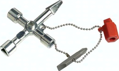 Ausführung: Glanzverzinkter Schaltschrankschlüssel aus Zinkdruckguss für alle gängigen Schaltschrankschließungen und Absperrsysteme in der Haustechnik. Jeder Schaltschrankschlüssel wird mit Bitadapter und Wendebit (Kreuzschlitz PH2, Schlitz 1 x 7 mm), sowie Befestigungskette geliefert.