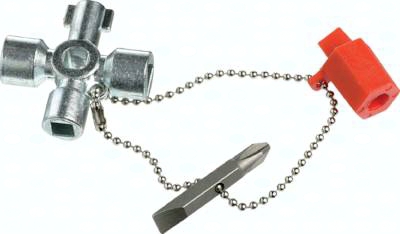 Ausführung: Glanzverzinkter Schaltschrankschlüssel aus Zinkdruckguss für alle gängigen Schaltschrankschließungen und Absperrsysteme in der Haustechnik. Jeder Schaltschrankschlüssel wird mit Bitadapter und Wendebit (Kreuzschlitz PH2, Schlitz 1 x 7 mm), sowie Befestigungskette geliefert.