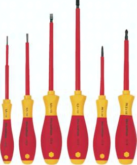 SDREH SPH SET6i, SDREH SPZ SET 6i, SDREH TX SET6i: Wiha-Schraubendreher -SoftFinish- mit ergonomischen (rundem) Mehrkomponentengriff mit Wegrollschutz, handschonende Geometrie für höchste Drehmomente, ChromTop®-Spitze garantiert höchste Maßhaltigkeit. Sechskantklinge mit Schlüsselhilfe, Kennzeichnung des Griffs mit Profilgöße. SDREHE SPH SET6i: Wiha-VDE-Schraubendreher -SoftFinish- mit ergonomischem (rundem) Mehrkomponentengriff mit Wegrollschutz, Kennzeichnung des Griffs mit Profilgröße. Zusätzlich Isolierung einzelstückgeprüft gem. DIN EN 60900 (IEC 60900 : 2004) für garantiert sicheres Arbeiten unter Spannung bis 1000 Volt. SDREH SPH SET6, SDREH SPZ SET6, SDREH TX SET6: Wera-Kraftform-Plus-Schraubendreher: Noch bessere Arbeitsergebnisse durch ergonomischen Mehrkomponentengriff mit Wegrollschutz, spezialgehärtete Klinge, Sechskantklinge und Schlüsselhilfe, Kennzeichnung des Griffs mit Schraubensymbol und Profilgröße SDREHE SPH SET7, SDREHE SPZ SET7: Wera-VDE-Kraftform-Plus-Schraubendreher: Noch bessere Arbeitsergebnisse durch ergonomische Mehrkomponentengriff mit Wegrollschutz, spezialgehärtete Klinge, Kennzeichnung des Griffs mit Schraubensymbol und Profilgröße. Zusätzlich Isolierung einzelstückgeprüft gem. DIN EN 60900 (IEC 60900 : 2004) für garantiert sicheres Arbeiten unter Spannung bis 1000 Volt. SDREHM SPH SET6, SDREHM SPZ SET6: Wera-Schraubmeißel: Noch bessere Arbeitsergebnisse durch ergonomischen Mehrkomponentengriff mit Wegrollschutz. Zusätzlich mit durchgehender, extra zäher Sechskantklinge mit Schlüsselhilfe und im Griff integrierter Schlagkappe *ohne Schlüsselhilfe, **ohne Lastertip, ***Rundklinge, ohne Schlüsselhilfe, ****ohne Schlüsselhilfe und Schlagkappe