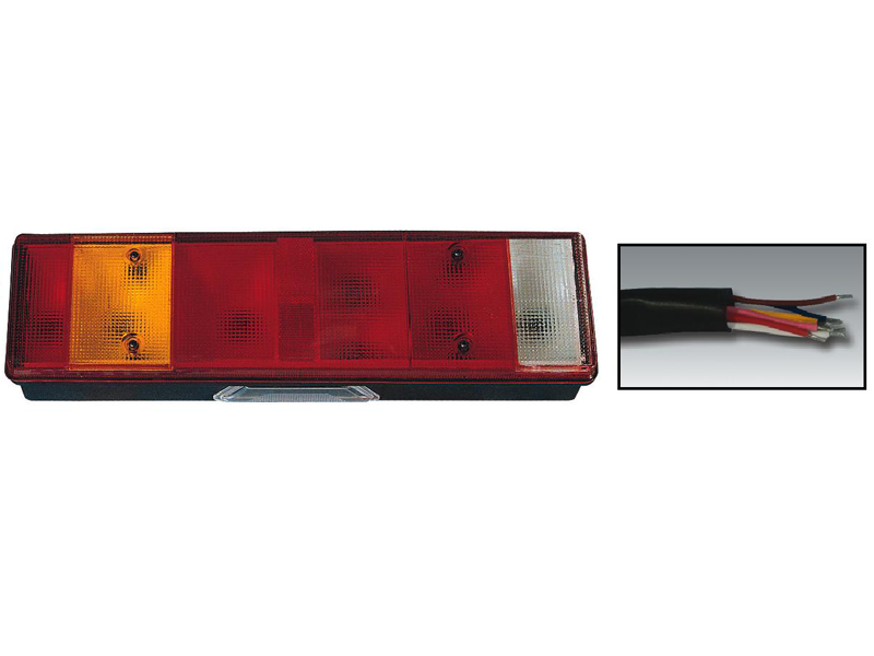 Lampa Stop cu 7 compartimente, partea stanga: cu marker de contur, lampa de directie, indicator, stop spate, ceata, numar de inregistrare si contur, reflectorizant universal si cablu.Dimensiuni: 467x132x79 mm