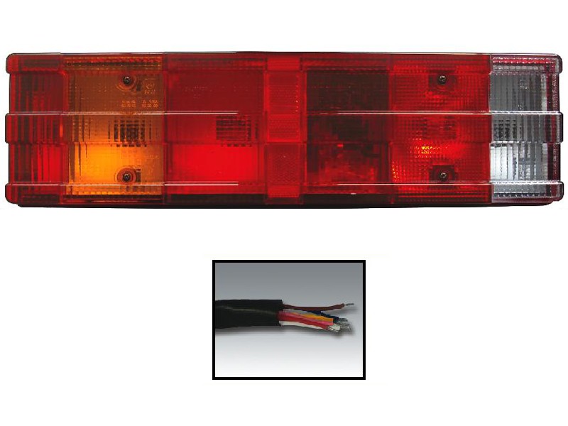 Lampa Stop cu 7 compartimente, partea stanga. Indicator stop, ceata, numar de inregistrare si contur, reflectorizant universal cu cablu.Dimensiuni: 467x131x86