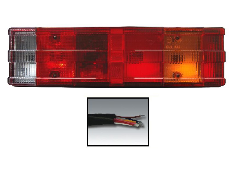 Lampa Stop cu 7 compartimente, partea dreapta. Indicator stop, ceata, numar de inregistrare si contur, reflectorizant universal cu cablu.Dimensiuni: 467x131x86