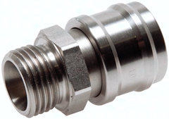 Werkstoffe: Gehäuse: Messing, Messing vernickelt, Stahl gehärtet, 1.4305, Dichtung: NBR (Edelstahl: Viton) Temperaturbereich: -20°C bis max. +100°C (Edelstahl: -15°C bis max. +200°C, Kunststoffhülse max. +80°C) Betriebsdruck: 0 - 35 bar sowie Grobvakuum, CEJN-Kupplungen: 0 - 16 bar Durchfluss***: Bolzenverriegelung: 1100 l/min (Option -BA: 800 l/min), Kugelverriegelung: 1800 l/min, CEJN-Kupplung: 2100 l/min, Kugelverriegelung/Kunststoffhülse: 2100 l/min ***6 bar Eingangsdruck, 0,5 bar Druckdifferenz Achtung: Nur folgende Paarungen von Kupplungsdose und Kupplungsstecker sind möglich: Kupplungsdose absperrend BA mit Kupplungsstecker ohne Ventil Kupplungsdose absperrend BA mit Kupplungsstecker absperrend BA Kompatibel zu**: Rectus (25, 26, 1600, 1625), TEMA (1600), CEJN (320), JWL (520, 530, 560), Legris (25, 26), Parker (PE, PEF), Prevost (E ... 07) und viele andere deutsche Fabrikate **Namen und Bezeichnungen sind z.T. eingetragene Warenzeichen der jeweiligen Hersteller. Optional: Verwendung für Stecker beidseitig absperrend -BA, NPT-Gewinde -NPT *SW 22 mit PTFE-beschichtetem G-Gewinde, optional mit SW 24 und unverlierbarem Dichtring: KDG 12 NW7-SW24
