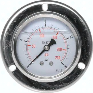 Werkstoffe: Gehäuse: 1.4301, Frontring: 1.4301, Messsystem und Zeigerwerk: Cu-Legierung, Sichtscheibe: Polycarbonat (Ø 100: Instrumentenflachglas) Anschlussgewinde: G 1/4"* rückseitig, zentrisch (Ø 100: G 1/2"* rückseitig, exzentrisch) Klasse: 1.6 (Ø 100: 1.0) Temperaturbereich: Umgebung: -20°C bis max. +60°C, Messstoff: max. +60°C Zifferblatt: 1. Skala außen (schwarz), Anzeige in bar, 2. Skala innen (rot), Anzeige in PSI (Ø 100: Anzeige in bar) Schutzart: IP 65 *mit Zentrierzapfen für Profildichtring