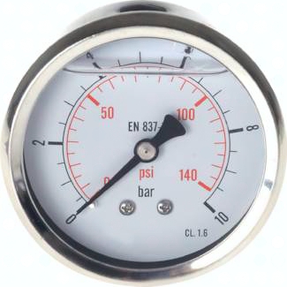 Werkstoffe: Gehäuse: 1.4301, Messsystem: Cu-Legierung, Anschluss: Messing, Sichtscheibe: Polycarbonat Anschlussgewinde: G 1/4"*, rückseitig zentrisch Klasse: 1.6 Temperaturbereich: Umgebung: -20°C bis max. +60°C, Messstoff: max. +60°C Zifferblatt: 1. Skala außen (schwarz), Anzeige in bar, 2. Skala innen (rot), Anzeige in PSI Schutzart: IP 65 *mit Zentrierzapfen für Profildichtring