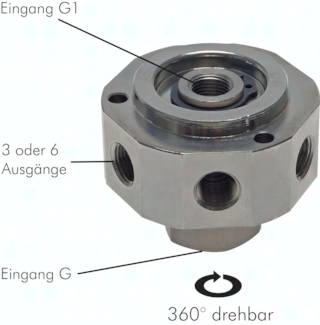 Ausführung: 2 gemeinsame Eingänge, 3 bzw. 6 gemeinsame Ausgänge Werkstoffe: Körper: Messing vernickelt, Dichtungen: PUR (G 3/4" : NBR), Führungszapfen, Flanschschraube und Sicherungsring: Stahl verzinkt Temperaturbereich: -10°C bis max. +85°C, andere Temperaturbereiche auf Anfrage Betriebsdruck: 0,5 - 12 bar Medien: geölte Druckluft, andere Medien auf Anfrage Optional: Einsatz für Vakuum -VU, Viton-Dichtungen -V