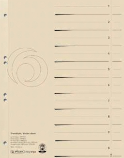 zum Trennen von DIN A4-Ablagen, aus gelochtem, umweltgerechtem RC-Kraftkarton, Vorderseite mit schwarzem Organisationsaufdruck, Lochrand verstärkt durch Hinterklebung, Abmessung: 240 x 300 mm