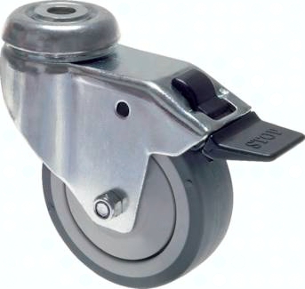 Eigenschaften: Einfache Rollenausführung für den innerbetrieblichen Einsatz auf glatten Böden. Stahlblechgehäuse, verzinkt-chromatiert. Räder mit Kunststofffelge und thermoplastischer Gummibandage, grau. Lagerart: Kugellager mit Fadenschutz (Ø 50 ohne Fadenschutz) *statische Belastung. Bei dynamischen Lasten müssen ca. 30% in Abzug gebracht werden