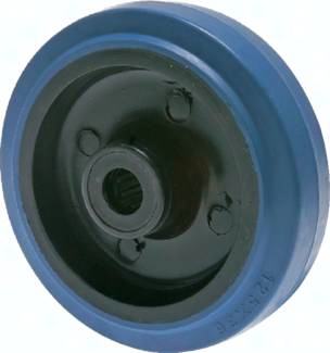 Eigenschaften: Elastik-Vollgummireifen, blau, spurfrei, auf Kunststoffradkörper, geringer Rollwiderstand. Lagerart: Rollenkorblager