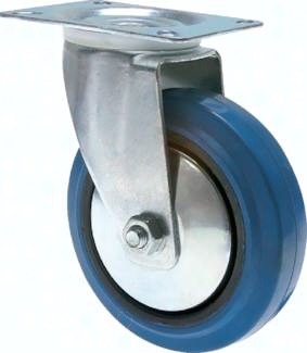 Eigenschaften: Hohe Elastizität, großer Fahrkomfort, fester Reifensitz und geringer Rollwiderstand zeichnen diese Rollen aus. Stahlblechgehäuse verzinkt, zweifacher Kugelkranz im Gabelkopf, Räder mit blauer Elastik-Vollgummibereifung, spurfrei, Radkörper aus Kunststoff, bis Ø 125 wird ein Fadenschutz mitgeliefert. Lagerart: Rollenkorblager *statische Belastung. Bei dynamischen Lasten müssen ca. 30% in Abzug gebracht werden