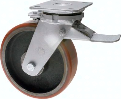 Eigenschaften: Geräuscharmer Lauf, robust und abriebfest sowie schnittfest gegen Metallspäne, beständig gegen viele aggressive Medien. Extra starke Stahlblechgehäuse, ab Ø 200 mm geschweißte Gehäuse, zweifache Kugellagerung im Gabelkopf. Lagerart: Kugellager (2-fach) *mit gelben PU-Belag, **statische Belastung. Bei dynamischen Lasten müssen ca. 30% in Abzug gebracht werden