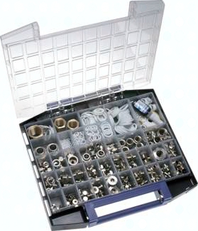 Beschreibung: Diese Multibox enthält 182 Verschlussstopfen, Reduziernippel, Doppelnippel und Muffen M 5 bis G 1" aus Messing vernickelt, zuzüglich passendem Dichtungsmaterial. Inhalt: 32 Verschlussstopfen, Messing vernickelt (M 5 - G 1/8" - G 1/4" - G 3/8" - G 1/2") 58 Reduziernippel / Vergrößerungsnippel, Messing vernickelt (M 5 - G 1/8" - G 1/4" - G 3/8" - G 1/2" - G 3/4" - G 1") 66 Doppelnippel, Messing vernickelt (M 5 - G 1/8" - G 1/4" - G 3/8" - G 1/2" - G 3/4" - G 1") 23 Muffen, Messing vernickelt (M 5 - G 1/8" - G 1/4" - G 3/8" - G 1/2") 3 Muffen, Messing (G 3/4" - G 1") 560 PVC-Dichtringe (M 5 - G 1/8" - G 1/4" - G 3/8" - G 1/2" - G 3/4" - G 1") 1 PTFE-Dichtband (Sanitärausführung) DB 121 10 ml anaerober Dichtstoff (Flüssigdichtung) 53.14/10
