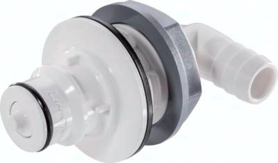 Steckerdurchmesser: 18,5 mm Durchfluss* Luft (Wasser): 1200 - 4100 l/min (15 - 57 l/min) Funktion: Wird durch Einstecken des Steckers in die Muffe bis zum hörbaren Klick gekuppelt. Ein Druck auf den ergonomischen Kunststoff-Entriegelungsknopf (gegen versehentliches Entriegeln geschützt) gibt den Stecker wieder frei. Es können Kupplungsstecker und Kupplungsdosen mit und ohne Absperrventil, sowie verschiedene Werkstoffe beliebig kombiniert werden. Das Absperrventil verhindert ein Austreten des Mediums im ungekuppelten Zustand. Typ Polypropylen: Werkstoffe: Körper, Ventile und Entriegelungstaste: Polypropylen (FDA-zertifiziert), Ventilfedern: Edelstahl AISI 316, Dichtungen: EPDM, äußere Feder unter Druckknopf: AISI 302, Schottmutter: Polypropylen, Schottdichtung: EPDM Temperaturbereich: 0°C bis max. +70°C Betriebsdruck: 0 - 4,2 bar, Vakuum bis 80%, (>+27°C Druckabschläge beachten: +40°C: max. 3,4 bar, +50°C: max. 2,7 bar, +60°C: max. 2,2 bar, +70°C: max. 1,7 bar) Medien: Druckluft, Wasser, viele Säuren und Laugen, Alkohole, Glykol, MEK, Sauerstoff**, Ozon, Kohlendioxid, viele Chemikalien Sterilisierbar durch: Formalin, Isopropylalkohol, Ethylalkohol, Ethylenoxid, Gammastrahlung Einsatzbereich: Für viele Chemikalien geeignet. Keine Beständigkeit gegenüber Mineralölen. Typ Polysulfon: Werkstoffe: Körper, Ventile und Entriegelungstaste: Polysulfon (FDA-zertifiziert), Ventilfedern: Edelstahl AISI 316, Dichtungen: EPDM, äußere Feder unter Druckknopf: AISI 302, Schottmutter: Polypropylen, Schottdichtung: EPDM Temperaturbereich: -40°C bis max. +138°C Betriebsdruck: 0 - 8,6 bar, Vakuum bis 80% (>+90°C Druckabschläge beachten: +100°C: max. 8,2 bar, +110°C: max. 7,8 bar, +120°C: max. 7,4 bar, +130°C: max. 7,1 bar, +138°C: max. 6,8 bar) Medien: Druckluft, Wasser, viele Säuren und Laugen, Alkohole, Glykol, Sauerstoff**, Ozon, viele Chemikalien Sterilisierbar durch: Formalin, Isopropylalkohol, Ethylalkohol, Ethylenoxid, Gammastrahlung, Erwärmung auf max. +121°C (ungekuppelt), Autoklavieren bei max. +121°C (ungekuppelt) Einsatzbereich: Kompatibel zu***: CPC-Colder HFC12, CPC-Colder HFC35 Für allgemeine Anwendungen, Anwendungen bei hohen Temperaturen. Keine Beständigkeit gegenüber Mineralölen. Nicht für Außenanwendungen geeignet, da nicht UV-stabilisiert. *bei 1 bar Druckabfall (je nach Konfiguration der Kupplungskombination: mit/ohne Ventil, Anschlussdimension, ... liegt der Durchfluss innerhalb des angegeben Bereichs), **vor Verwendung mit Sauerstoff unbedingt reinigen ***Namen und Bezeichnungen sind z.T. eingetragene Warenzeichen der jeweiligen Hersteller. Schottbohrung: Ø 30,8 mm, max. Blechdicke: 7,5 mm