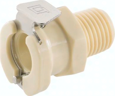 Steckerdurchmesser: 11 mm (Haltenutbreite ca. 1,3 mm) Durchfluss* Luft (Wasser): 560 - 2100 l/min (6 - 18 l/min) Funktion: Wird durch Einstecken des Steckers in die Muffe bis zum hörbaren "Klick" gekuppelt. Ein Druck auf den Entriegelungsknopf (bei Kunststoffkupplungen mit Schlauchanschluss gegen versehentliches Entriegeln geschützt) gibt den Stecker wieder frei. Es können Kupplungsstecker und Kupplungsdosen mit und ohne Absperrventil, sowie verschiedene Werkstoffe beliebig kombiniert werden. Das Absperrventil verhindert ein Austreten des Mediums im ungekuppelten Zustand. Typ POM: Werkstoffe: Körper und Ventile: Acetal (POM, FDA-zertifiziert), Ventilfedern: Edelstahl AISI 316, Dichtungen: NBR, Entriegelungstaste: AISI 301, Schottmutter: Messing vernickelt Temperaturbereich: -40°C bis max. +80°C Betriebsdruck: 0 - 8,3 bar, Vakuum bis 80% Medien: Druckluft, Wasser, Alkohole, Glykol, Mineralöle, Benzin, Sauerstoff**, Kohlendioxid, milde Chemikalien Sterilisierbar durch: Formalin, Isopropylalkohol, Ethylalkohol Einsatzbereich: Für allgemeine Anwendungen. Gute Beständigkeit gegenüber Mineralölen. Typ Polypropylen (Bitte Farbe angeben: beige = PPC oder grau = PPL): Werkstoffe: Körper und Ventile: Polypropylen (FDA-zertifiziert), Ventilfedern: Edelstahl AISI 316, Dichtungen: EPDM, Entriegelungstaste: AISI 301, Schottmutter: Messing vernickelt Temperaturbereich: 0°C bis max. +70°C Betriebsdruck: 0 - 8,3 bar, Vakuum bis 80%, (>+27°C Druckabschläge beachten: +40°C: max. 7 bar, +50°C: max. 6,5 bar, +60°C: max. 5,9 bar, +70°C: max. 5,2 bar) Medien: Druckluft, Wasser, viele Säuren und Laugen, Alkohole, Glykol, MEK, Sauerstoff**, Ozon, Kohlendioxid, viele Chemikalien Sterilisierbar durch: Formalin, Isopropylalkohol, Ethylalkohol, Ethylenoxid, Gammastrahlung Einsatzbereich: Für viele Chemikalien geeignet. Keine Beständigkeit gegenüber Mineralölen. Typ Messing verchromt: Werkstoffe: Körper: Messing verchromt (lebensmittelgeeignet), Ventile: Acetal (POM, FDA-zertifiziert), Ventilfedern: Edelstahl AISI 316, Dichtungen: NBR, Entriegelungstaste: AISI 301, Schottmutter: Messing vernickelt Temperaturbereich: -40°C bis max. +80°C Betriebsdruck: 0 - 17,3 bar, Vakuum bis 80% Medien: Druckluft, Alkohole, Glykol, Mineralöle, Benzin, Sauerstoff**, Kohlendioxid Sterilisierbar durch: Formalin, Isopropylalkohol, Ethylalkohol, Gammastrahlung, Erwärmung auf +121°C (ungekuppelt) Einsatzbereich: Für Anwendungen mit erhöhten Drücken oder mechanischen Belastungen (z.B. durch häufiges Kuppeln). Gute Beständigkeit gegenüber Mineralölen. *bei 1 bar Druckabfall (je nach Konfiguration der Kupplungskombination: mit/ohne Ventil, Anschlussdimension, ... liegt der Durchfluss innerhalb des angegebenen Bereichs), **vor Verwendung mit Sauerstoff unbedingt reinigen. Kompatibel zu****: CPC-Colder PLC, CPC-Colder PLC12, CPC-Colder LC