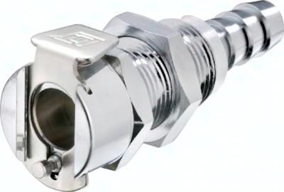 Steckerdurchmesser: 7,8 mm Durchfluss* Luft (Wasser): 50 - 500 l/min (0,4 - 6,5 l/min) Funktion: Wird durch Einstecken des Steckers in die Muffe bis zum hörbaren "Klick" gekuppelt. Ein Druck auf den Entriegelungsknopf (bei Kunststoffkupplungen mit Schlauchanschluss gegen versehentliches Entriegeln geschützt) gibt den Stecker wieder frei. Es können Kupplungsstecker und Kupplungsdosen mit und ohne Absperrventil, sowie verschiedene Werkstoffe beliebig kombiniert werden. Das Absperrventil verhindert ein Austreten des Mediums im ungekuppelten Zustand. Typ POM: Werkstoffe: Körper und Ventile: Acetal (POM, FDA-zertifiziert), Ventilfedern: Edelstahl AISI 316, Dichtungen: NBR, Entriegelungstaste: AISI 301, Schottmutter: Messing vernickelt Temperaturbereich: -40°C bis max. +80°C Betriebsdruck: 0 - 8,3 bar, Vakuum bis 80% Medien: Druckluft, Wasser, Alkohole, Glykol, Mineralöle, Benzin, Sauerstoff**, Kohlendioxid, milde Chemikalien Sterilisierbar durch: Formalin, Isopropylalkohol, Ethylalkohol Einsatzbereich: Für allgemeine Anwendungen. Gute Beständigkeit gegenüber Mineralölen. Typ Polypropylen (Bitte Farbe angeben: beige = PPC oder grau = PPL): Werkstoffe: Körper und Ventile: Polypropylen (FDA-zertifiziert), Ventilfedern: Edelstahl AISI 316, Dichtungen: EPDM, Entriegelungstaste: AISI 301, Schottmutter: Messing vernickelt Temperaturbereich: 0°C bis max. +70°C Betriebsdruck: 0 - 8,3 bar, Vakuum bis 80%, (>+27°C Druckabschläge beachten: +40°C: max. 7 bar, +50°C: max. 6,5 bar, +60°C: max. 5,9 bar, +70°C: max. 5,2 bar) Medien: Druckluft, Wasser, viele Säuren und Laugen, Alkohole, Glykol, MEK, Sauerstoff**, Ozon, Kohlendioxid, viele Chemikalien Sterilisierbar durch: Formalin, Isopropylalkohol, Ethylalkohol, Ethylenoxid, Gammastrahlung Einsatzbereich: Für viele Chemikalien geeignet. Keine Beständigkeit gegenüber Mineralölen. Typ Messing verchromt: Werkstoffe: Körper: Messing verchromt (lebensmittelgeeignet), Ventile: Acetal (POM, FDA-zertifiziert), Ventilfedern: Edelstahl AISI 316, Dichtungen: NBR, Entriegelungstaste: AISI 301, Schottmutter: Messing vernickelt Temperaturbereich: -40°C bis max. +80°C Betriebsdruck: 0 - 17,3 bar, Vakuum bis 80% Medien: Druckluft, Alkohole, Glykol, Mineralöle, Benzin, Sauerstoff**, Kohlendioxid Sterilisierbar durch: Formalin, Isopropylalkohol, Ethylalkohol, Gammastrahlung, Erwärmung auf +121°C (ungekuppelt) Einsatzbereich: Für Anwendungen mit erhöhten Drücken oder mechanischen Belastungen (z.B. durch häufiges Kuppeln). Gute Beständigkeit gegenüber Mineralölen. *bei 1 bar Druckabfall (je nach Konfiguration der Kupplungskombination: mit/ohne Ventil, Anschlussdimension, ... liegt der Durchfluss innerhalb des angegebenen Bereichs), **vor Verwendung mit Sauerstoff unbedingt reinigen. Kompatibel zu****: CPC-Colder PMC, CPC-Colder PMC12, CPC-Colder MC ****Namen und Bezeichnungen sind z.T. eingetragene Warenzeichen der jeweiligen Hersteller. Schottgewinde: 1/2" - 24 UNF (Ø 12,7 mm), max. Blechdicke: 12 mm)