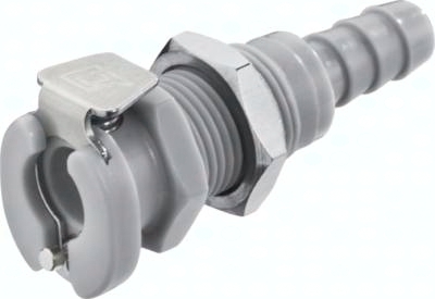 Steckerdurchmesser: 7,8 mm Durchfluss* Luft (Wasser): 50 - 500 l/min (0,4 - 6,5 l/min) Funktion: Wird durch Einstecken des Steckers in die Muffe bis zum hörbaren "Klick" gekuppelt. Ein Druck auf den Entriegelungsknopf (bei Kunststoffkupplungen mit Schlauchanschluss gegen versehentliches Entriegeln geschützt) gibt den Stecker wieder frei. Es können Kupplungsstecker und Kupplungsdosen mit und ohne Absperrventil, sowie verschiedene Werkstoffe beliebig kombiniert werden. Das Absperrventil verhindert ein Austreten des Mediums im ungekuppelten Zustand. Typ POM: Werkstoffe: Körper und Ventile: Acetal (POM, FDA-zertifiziert), Ventilfedern: Edelstahl AISI 316, Dichtungen: NBR, Entriegelungstaste: AISI 301, Schottmutter: Messing vernickelt Temperaturbereich: -40°C bis max. +80°C Betriebsdruck: 0 - 8,3 bar, Vakuum bis 80% Medien: Druckluft, Wasser, Alkohole, Glykol, Mineralöle, Benzin, Sauerstoff**, Kohlendioxid, milde Chemikalien Sterilisierbar durch: Formalin, Isopropylalkohol, Ethylalkohol Einsatzbereich: Für allgemeine Anwendungen. Gute Beständigkeit gegenüber Mineralölen. Typ Polypropylen (Bitte Farbe angeben: beige = PPC oder grau = PPL): Werkstoffe: Körper und Ventile: Polypropylen (FDA-zertifiziert), Ventilfedern: Edelstahl AISI 316, Dichtungen: EPDM, Entriegelungstaste: AISI 301, Schottmutter: Messing vernickelt Temperaturbereich: 0°C bis max. +70°C Betriebsdruck: 0 - 8,3 bar, Vakuum bis 80%, (>+27°C Druckabschläge beachten: +40°C: max. 7 bar, +50°C: max. 6,5 bar, +60°C: max. 5,9 bar, +70°C: max. 5,2 bar) Medien: Druckluft, Wasser, viele Säuren und Laugen, Alkohole, Glykol, MEK, Sauerstoff**, Ozon, Kohlendioxid, viele Chemikalien Sterilisierbar durch: Formalin, Isopropylalkohol, Ethylalkohol, Ethylenoxid, Gammastrahlung Einsatzbereich: Für viele Chemikalien geeignet. Keine Beständigkeit gegenüber Mineralölen. Typ Messing verchromt: Werkstoffe: Körper: Messing verchromt (lebensmittelgeeignet), Ventile: Acetal (POM, FDA-zertifiziert), Ventilfedern: Edelstahl AISI 316, Dichtungen: NBR, Entriegelungstaste: AISI 301, Schottmutter: Messing vernickelt Temperaturbereich: -40°C bis max. +80°C Betriebsdruck: 0 - 17,3 bar, Vakuum bis 80% Medien: Druckluft, Alkohole, Glykol, Mineralöle, Benzin, Sauerstoff**, Kohlendioxid Sterilisierbar durch: Formalin, Isopropylalkohol, Ethylalkohol, Gammastrahlung, Erwärmung auf +121°C (ungekuppelt) Einsatzbereich: Für Anwendungen mit erhöhten Drücken oder mechanischen Belastungen (z.B. durch häufiges Kuppeln). Gute Beständigkeit gegenüber Mineralölen. *bei 1 bar Druckabfall (je nach Konfiguration der Kupplungskombination: mit/ohne Ventil, Anschlussdimension, ... liegt der Durchfluss innerhalb des angegebenen Bereichs), **vor Verwendung mit Sauerstoff unbedingt reinigen. Kompatibel zu****: CPC-Colder PMC, CPC-Colder PMC12, CPC-Colder MC ****Namen und Bezeichnungen sind z.T. eingetragene Warenzeichen der jeweiligen Hersteller. Schottgewinde: 1/2" - 24 UNF (Ø 12,7 mm), max. Blechdicke: 12 mm)