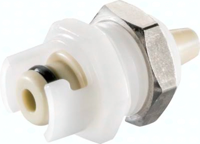 Steckerdurchmesser: 6,1 mm Durchfluss* Luft (Wasser): 40 - 200 l/min (0,3 - 2,6 l/min) Betriebsdruck: 0 - 7 bar, Vakuum bis 80% Funktion: Wird durch Verdrehen des Steckers und der Muffe bis zum hörbaren "Klick" gekuppelt. Es können Kupplungsstecker und Kupplungsdosen mit und ohne Absperrventil sowie verschiedene Werkstoffe beliebig kombiniert werden. Das Absperrventil verhindert ein Austreten des Mediums im ungekuppelten Zustand. Idealer Ersatz für "Luer"-Verbindungen in der Medizintechnik. Im gekuppelten Zustand sind die Schlauchtüllen innerhalb der Bajonettverschlüsse frei drehbar und verhindern so ein Abknicken oder Verdrehen des Schlauches. Typ POM: Werkstoffe: Körper und Ventile: Acetal (POM, FDA-zertifiziert), Ventilfedern; Edelstahl AISI 316, Dichtungen: NBR, Bajonettverschluss: Acetal (POM, FDA-zertifiziert), Schottmutter: Messing vernickelt Temperaturbereich: -40°C bis max. +80°C Medien: Druckluft, Wasser, Alkohole, Glykol, Mineralöle, Benzin, Sauerstoff**, Kohlendioxid, milde Chemikalien Sterilisierbar durch: Formalin, Isopropylalkohol, Ethylalkohol Einsatzbereich: Für allgemeine Anwendungen. Gute Beständigkeit gegenüber Mineralölen. Typ Polypropylen: Werkstoffe: Körper und Ventile: Polypropylen (FDA-zertifiziert), Ventilfedern: Edelstahl AISI 316, Dichtungen: EPDM, Bajonettverschluss: Acetal (POM, FDA-zertifiziert), Schottmutter: Messing vernickelt Temperaturbereich: 0°C bis max. +80°C Medien: Druckluft, Wasser, viele Säuren und Laugen, Alkohole, Glykol, MEK, Sauerstoff**, Ozon, Kohlendioxid, viele Chemikalien Sterilisierbar durch: Formalin, Isopropylalkohol, Ethylalkohol, Ethylenoxid, Gammastrahlung Einsatzbereich: Für viele Chemikalien geeignet. Keine Beständigkeit gegenüber Mineralölen. *bei 1 bar Druckabfall (je nach Konfiguration der Kupplungskombination: mit/ohne Ventil, Anschlussdimension, ... liegt der Durchfluss innerhalb des angegebenen Bereichs), **vor Verwendung mit Sauerstoff unbedingt reinigen. Kompatibel zu***: CPC-Colder SMC ***Namen und Bezeichnungen sind z.T. eingetragene Warenzeichen der jeweiligen Hersteller. Schottgewinde: 7/16"-24 UNF (Ø 11,2 mm), max. Blechdicke: 5,3 mm Hinweis: Schlauch kann aus Platzgründen nicht mit Schelle befestigt werden, sondern wird nur auf die Tülle aufgesteckt.