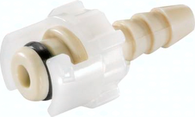 Steckerdurchmesser: 6,1 mm Durchfluss* Luft (Wasser): 40 - 200 l/min (0,3 - 2,6 l/min) Betriebsdruck: 0 - 7 bar, Vakuum bis 80% Funktion: Wird durch Verdrehen des Steckers und der Muffe bis zum hörbaren "Klick" gekuppelt. Es können Kupplungsstecker und Kupplungsdosen mit und ohne Absperrventil sowie verschiedene Werkstoffe beliebig kombiniert werden. Das Absperrventil verhindert ein Austreten des Mediums im ungekuppelten Zustand. Idealer Ersatz für "Luer"-Verbindungen in der Medizintechnik. Im gekuppelten Zustand sind die Schlauchtüllen innerhalb der Bajonettverschlüsse frei drehbar und verhindern so ein Abknicken oder Verdrehen des Schlauches. Typ POM: Werkstoffe: Körper und Ventile: Acetal (POM, FDA-zertifiziert), Ventilfedern; Edelstahl AISI 316, Dichtungen: NBR, Bajonettverschluss: Acetal (POM, FDA-zertifiziert), Schottmutter: Messing vernickelt Temperaturbereich: -40°C bis max. +80°C Medien: Druckluft, Wasser, Alkohole, Glykol, Mineralöle, Benzin, Sauerstoff**, Kohlendioxid, milde Chemikalien Sterilisierbar durch: Formalin, Isopropylalkohol, Ethylalkohol Einsatzbereich: Für allgemeine Anwendungen. Gute Beständigkeit gegenüber Mineralölen. Typ Polypropylen: Werkstoffe: Körper und Ventile: Polypropylen (FDA-zertifiziert), Ventilfedern: Edelstahl AISI 316, Dichtungen: EPDM, Bajonettverschluss: Acetal (POM, FDA-zertifiziert), Schottmutter: Messing vernickelt Temperaturbereich: 0°C bis max. +80°C Medien: Druckluft, Wasser, viele Säuren und Laugen, Alkohole, Glykol, MEK, Sauerstoff**, Ozon, Kohlendioxid, viele Chemikalien Sterilisierbar durch: Formalin, Isopropylalkohol, Ethylalkohol, Ethylenoxid, Gammastrahlung Einsatzbereich: Für viele Chemikalien geeignet. Keine Beständigkeit gegenüber Mineralölen. *bei 1 bar Druckabfall (je nach Konfiguration der Kupplungskombination: mit/ohne Ventil, Anschlussdimension, ... liegt der Durchfluss innerhalb des angegebenen Bereichs), **vor Verwendung mit Sauerstoff unbedingt reinigen. Kompatibel zu***: CPC-Colder SMC ***Namen und Bezeichnungen sind z.T. eingetragene Warenzeichen der jeweiligen Hersteller.