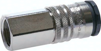 Werkstoffe: Typ MS-vernickelt: Gehäuse Messing vernickelt, Schiebehülse: Stahl vernickelt, Dichtung: NBR Typ MS/Stahl: Gehäuse: Messing vernickelt/Stahl (QPQ), Schiebehülse: Messing vernickelt, Dichtung: NBR Typ CEJN: Gehäuse Stahl/Messing verzinkt, Dichtung: NBR, Typ 1.4305: Gehäuse und Schiebehülse: 1.4305, Dichtung: Viton Temperaturbereich: -20°C bis max. +100°C (Edelstahl: -15°C bis max. +200°C) Betriebsdruck: 0 - 35 bar, sowie Grobvakuum, CEJN-Kupplungen: 0 - 16 bar Kompatibel zu***: Rectus (27, 41, 1700, 1727), TEMA (1700), CEJN (410) Durchfluss: MS-vernickelt/1.4305: 2600 l/min (Option: -BA: 2100 l/min), Messing/Stahl: 3600 l/min, CEJN-Kupplung: 3900 l/min (6 bar Eingangsdruck, 0,5 bar Druckdifferenz) Achtung: Nur folgende Paarungen von Kupplungsdose und Kupplungsstecker sind möglich: Kupplungsdose absperrend BA mit Kupplungsstecker ohne Ventil Kupplungsdose absperrend BA mit Kupplungsstecker absperrend BA ***Namen und Bezeichnungen sind z.T. eingetragene Warenzeichen der jeweiligen Hersteller. Optional: Körper aus 1.4404 -ES4A, Verwendung für Stecker beidseitig absperrend -BA